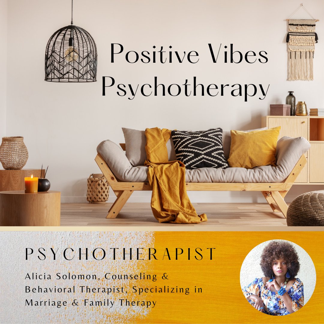 License #: 85086My Therapy Philosophy Hello! My name is Alicia Solomon, and I am a counseling and behavioral therapist that specializes in marriage and family therapy. I currently provide in-person & virtual online therapy here at Positive Vibes Psychotherapy, PLLC throughout Texas. My goal is to empower each individual that I work with to become the best version of themselves. I look forward to working with you as you start your journey to success. Background & Education: I was born in Texas and raised in Arkansas. I lived in Washington, DC during my early adult years. I have a Bachelor of Science in Psychology and Business Management from Texas A&M University-Texarkana. I graduated from LeTourneau University in Longview, TX with a Master of Arts in Professional Counseling and Marriage and Family therapy. I also have a master’s level certification in Applied Behavioral Analysis from Capella University. I am a National Certified Counselor and a Licensed Professional Counselor. In my free time, I love to be creative, design things, travel, read good books, meet new people, and try new things that are positive and bring me joy. I have a digital magazine, I am a self-starter, and I love to share positive and empowering information with my followers around the world through conferences and podcasting.